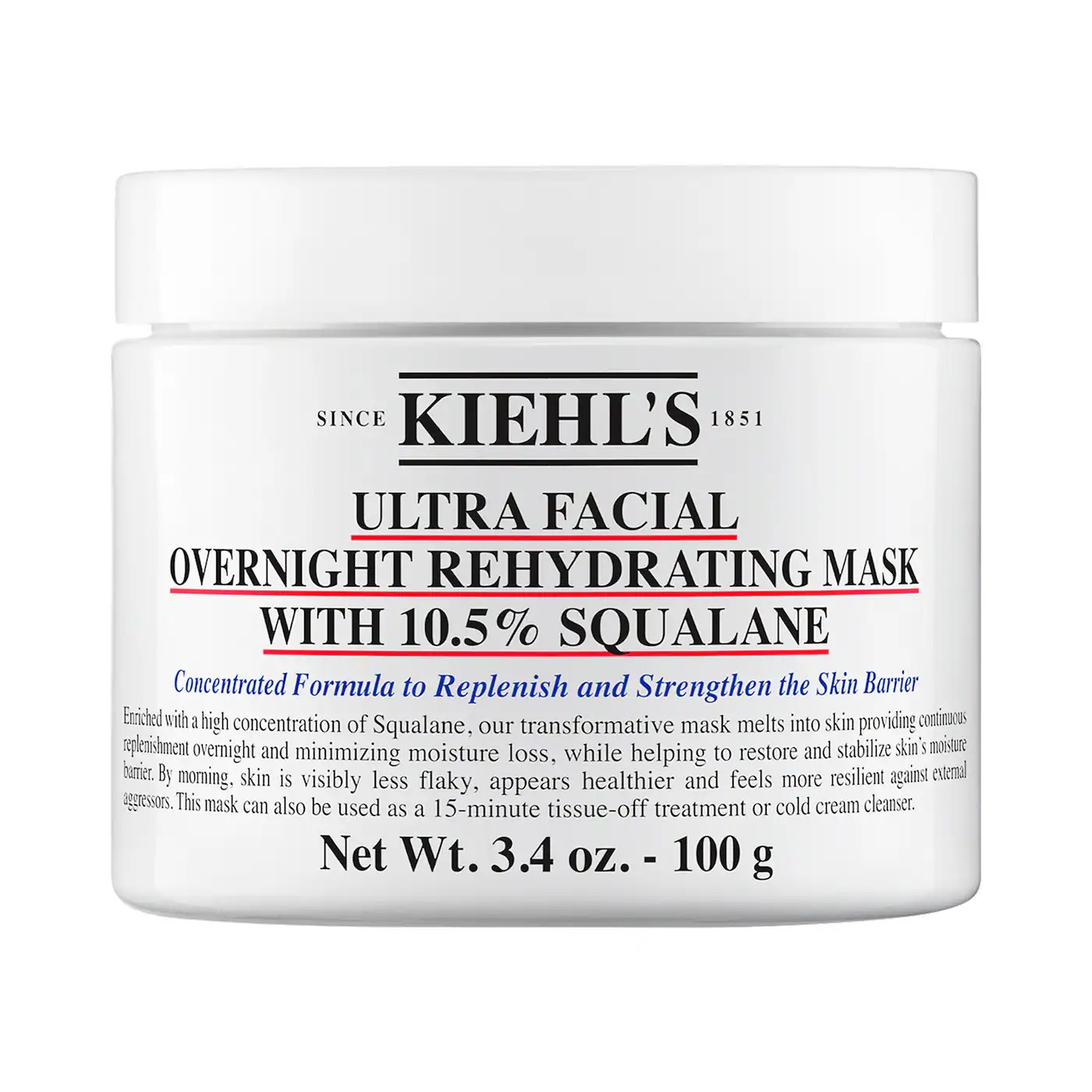 Una mascarilla facial hidratante sin perfume con un 10,5 % de escualano para pieles secas que retiene la humedad durante la noche y fortalece la barrera de hidratación de la piel.