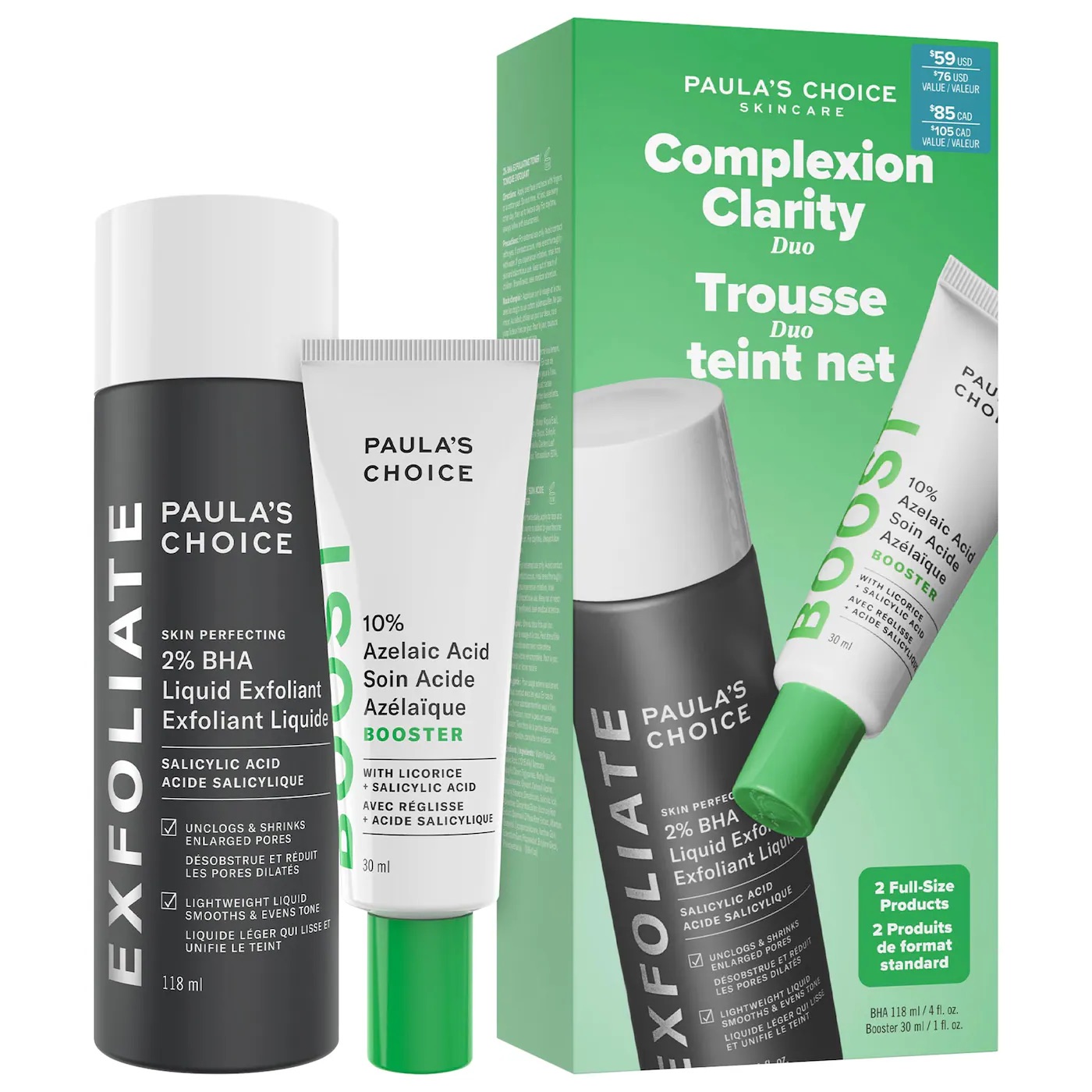 Un dúo superventas compuesto por un tónico exfoliante con BHA al 2 % y un potenciador de ácido azelaico al 10 % para desobstruir rápidamente los poros, unificar visiblemente el tono y aclarar la piel.
