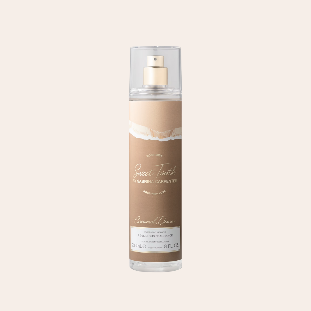 Caramel Dream Body Mist de Sabrina Carpenter huele como un postre rico y decadente con notas de chocolate oscuro aterciopelado, ámbar caramelizado dulce, leche de almendras suave, toques de cítricos azucarados (limón/naranja), vainilla cremosa y una base cálida de sándalo, almizcle y pachulí, creando un aroma cálido, gourmand y ligeramente complejo, a menudo descrito como una versión más madura y achocolatada de su fragancia original Sweet Tooth, como un postre sofisticado o incluso una naranja con chocolate.