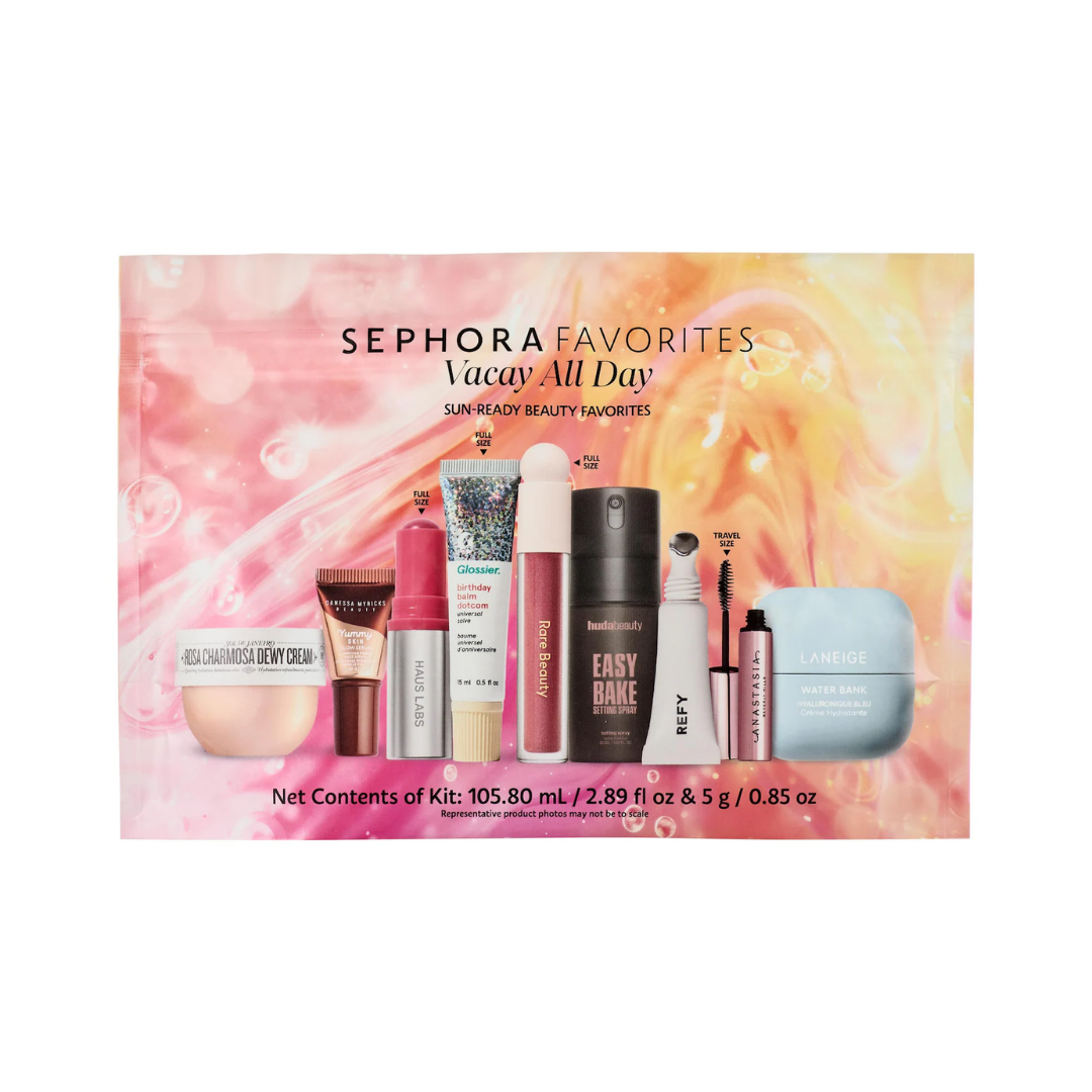 Mantén tu piel hidratada y radiante durante todo el verano con este kit imprescindible. Este set incluye 9 productos diseñados para darte un brillo veraniego dondequiera que vayas. Un set de nueve productos imprescindibles de maquillaje y cuidado facial para una piel radiante, de marcas como Rare Beauty, LANEIGE y Sol de Janeiro.